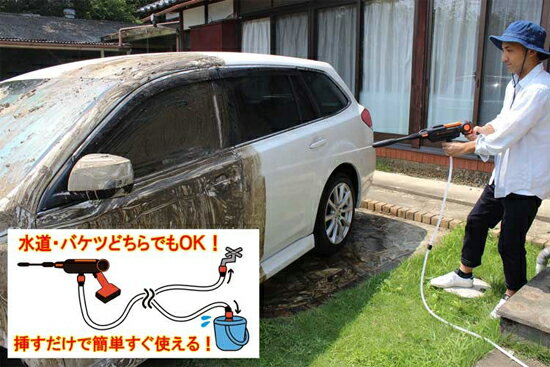 水道の蛇口がない場所でも、バケツの水から吸い上げて噴射!コードレスなので、池や川などが近くにあれば、蛇口がなくても使用できる高圧洗浄器です。
